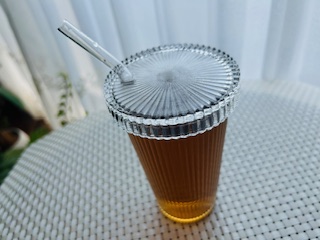 ストロー付の蓋付きガラスタンブラーを