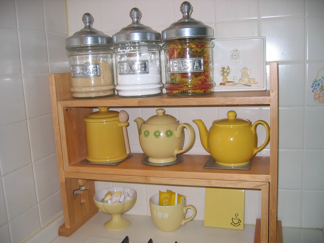 黄色のポットにキャニスター、マグカップ。