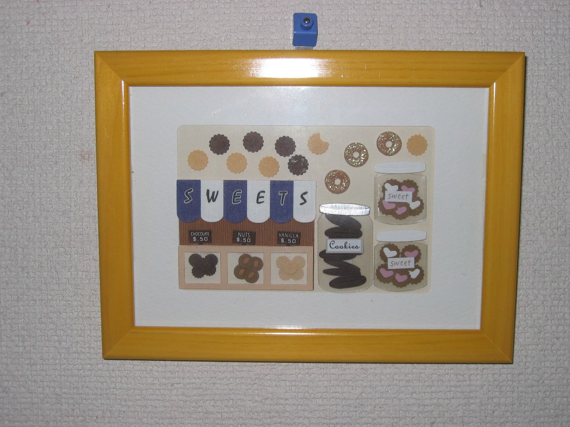 市販のクッキーのシールを好きなように貼って手作りしたもの。