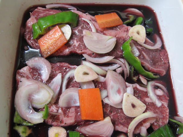 まずはお肉を赤ワインと炭酸水、