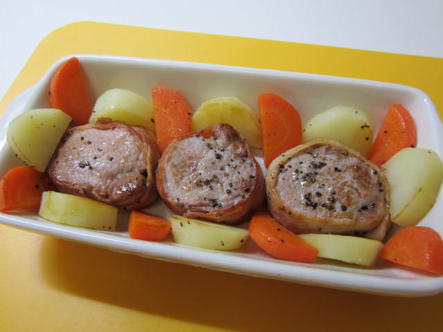 まず豚ヒレ肉にベーコンを巻き、