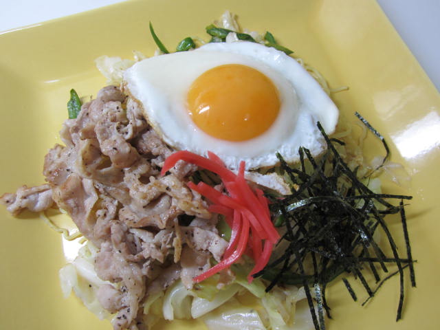 焼きそばを皿に盛り、焼いた豚肉、