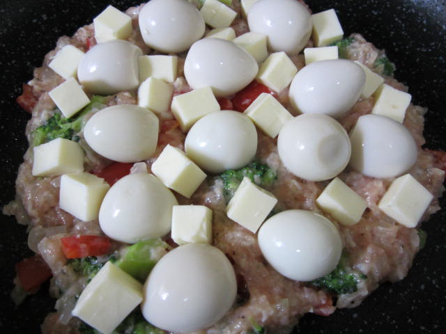 半量を円形に。その上にうずら卵と