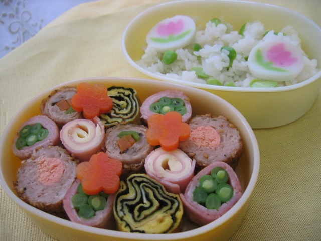 上記に加えてもう3品のくるくるを添え、今日のおべんとうは