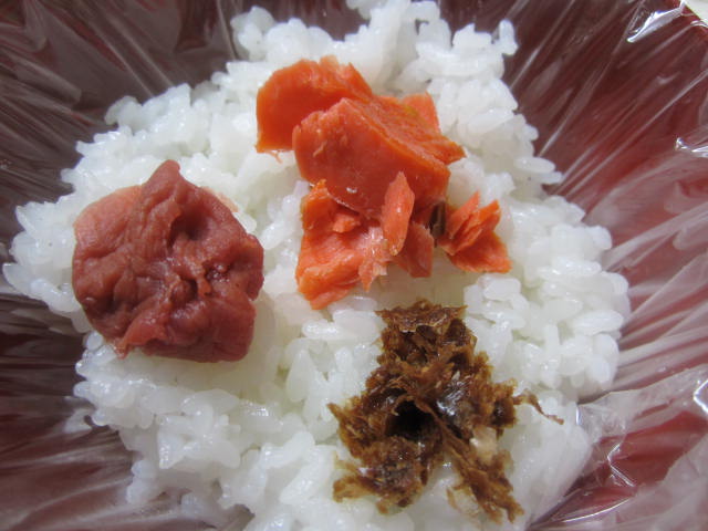 中身はシャケと梅干、おかかの