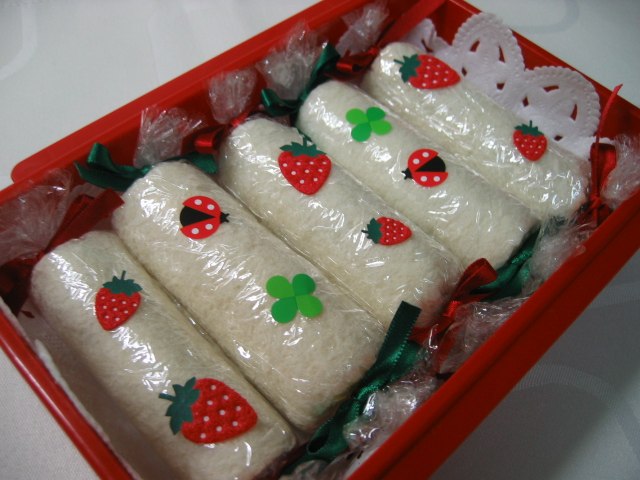 今日はおべんと箱が赤なので、リボンとシールも赤とグリーンで