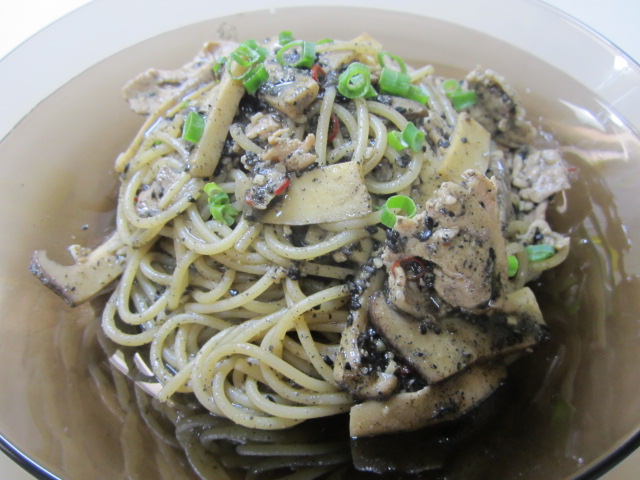豚肉とエリンギの黒ごまパスタ。