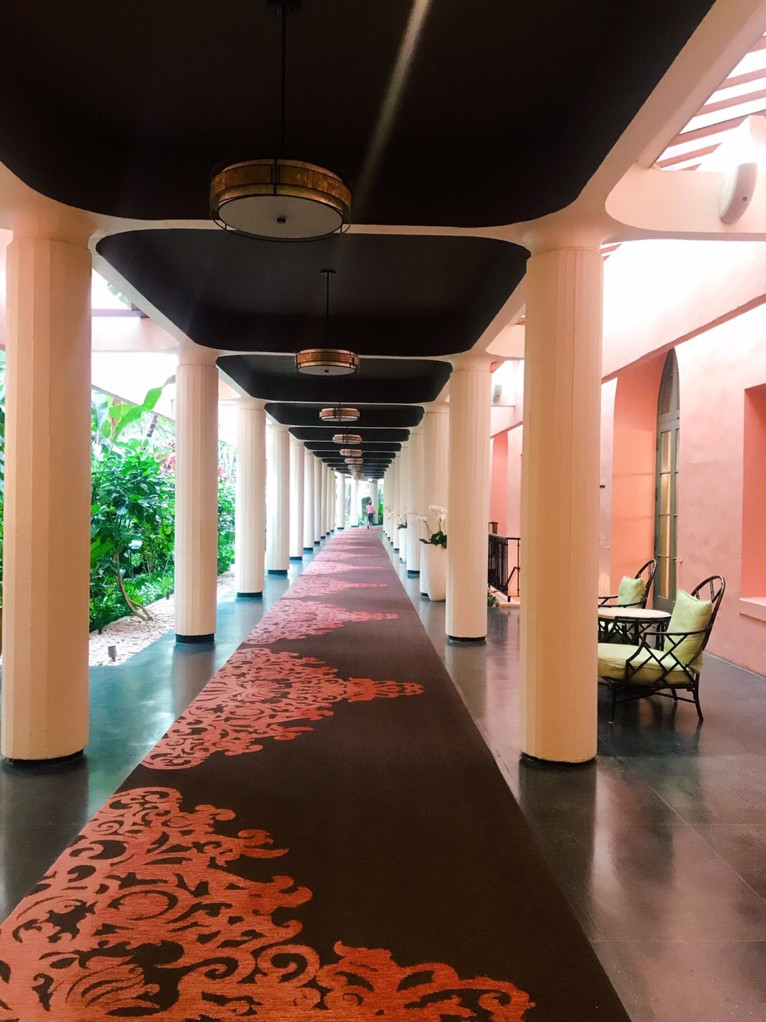 廊下のカーペットもピンク色。