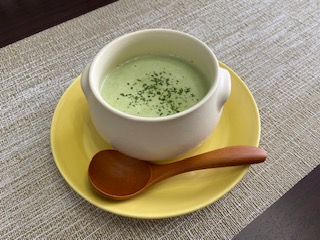 優しい色合い、青豆のポタージュ、