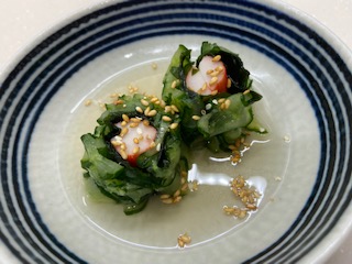 わかめとカニカマを巻き、生姜酢を