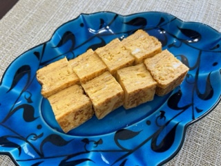 お出汁たっぷりの甘い卵焼きと。