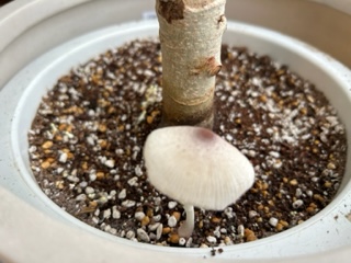 ゴムの木の鉢にキノコが生えていて