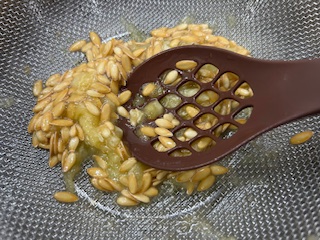 こうしてザルで漉しています。