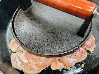 鉄鍋に鉄のプレスで鶏肉を