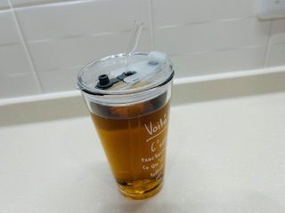 ストロー付きのガラスタンブラーで。