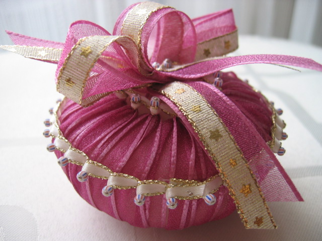 リボンをくるくる巻きつけたもの。飾りを兼ねた芳香剤ですね。