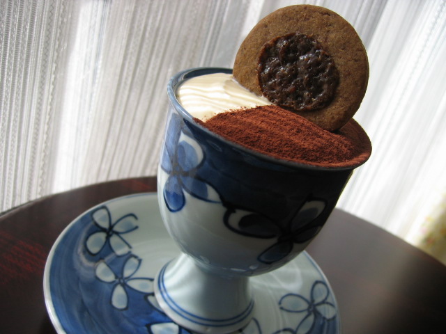 ココアをふり、コーヒー風味のクッキーを飾って