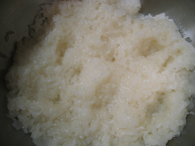 まずはもち米を炊いて、熱い