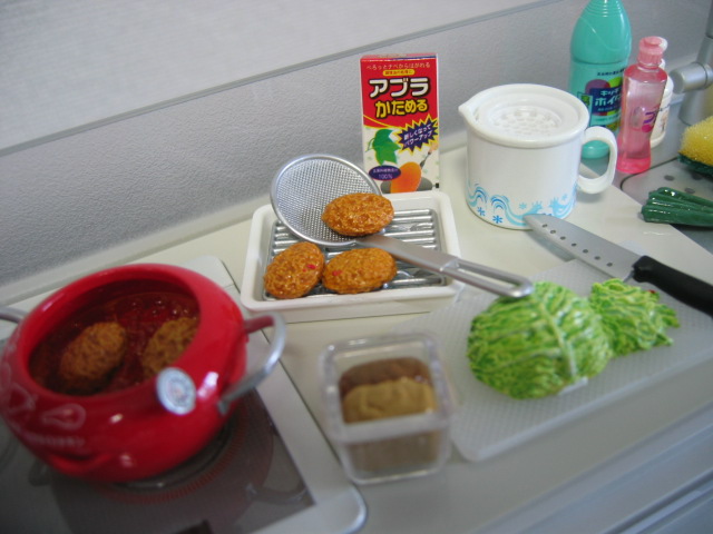 コロッケを揚げながら、キャベツを