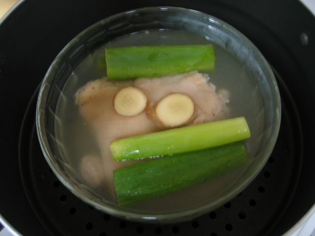 晩ごはんは蒸し鶏。