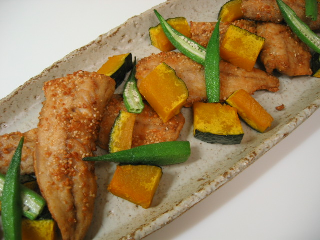 アジに添えたかぼちゃとオクラの素揚げ。