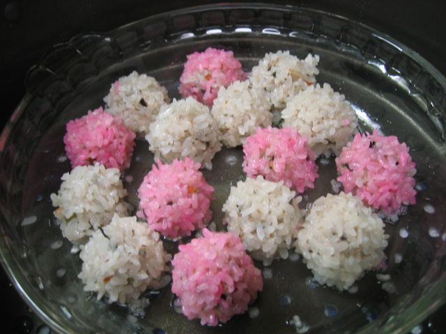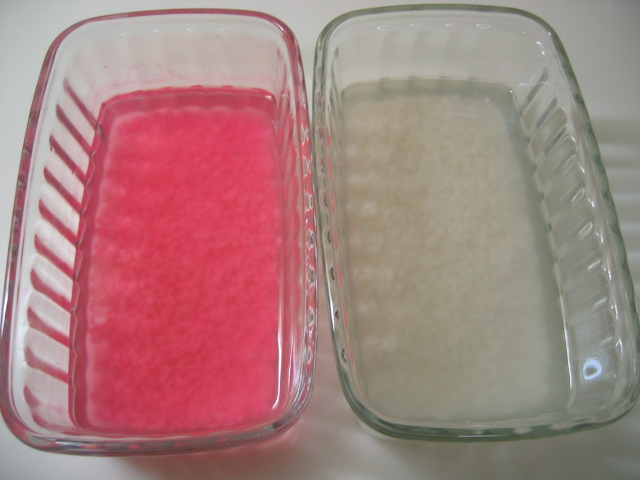 ピンクのもち米はいつも食紅の加減を