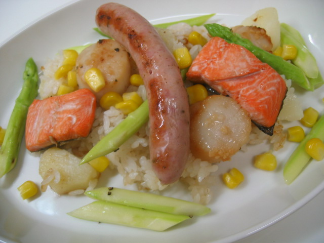 鮭の照り焼き、ホタテのにんにくバター焼き、