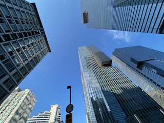 青い空、高層ビル。